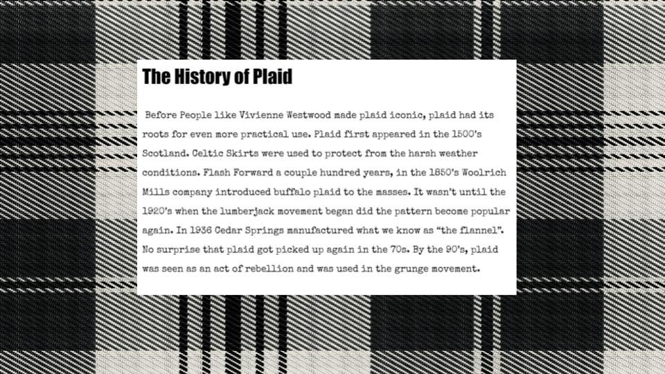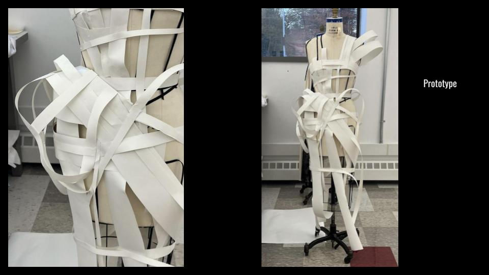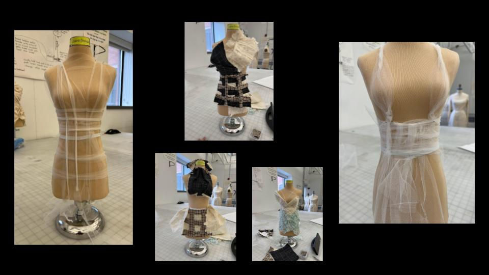 When asked to wear something that expressed my identity, I found myself in a plaid mini skirt and white airforce ones. From there, I researched the history of the two pieces and asked how they represented me. I grew up extremely religious and because of that, I was limited in several areas including the way I dressed. I wanted to deconstruct the ideals that I was taught, and as a result, I created my own plaid by cutting up and weaving together pieces of sermons as well as religious texts that I didn't agree with.